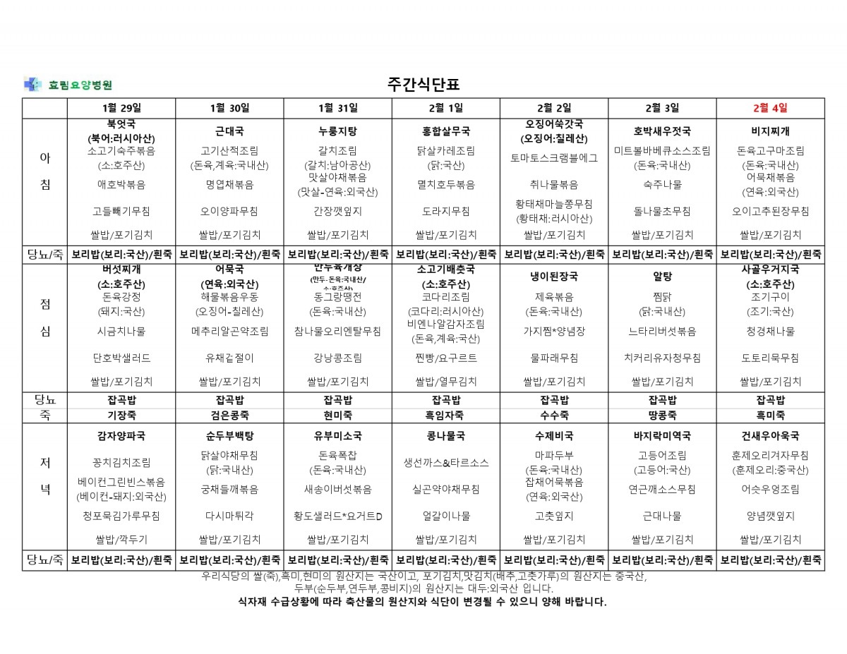 효림요양병원 1월5주차-2월1주차 식단표입니다.